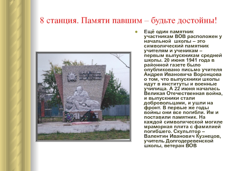 и ученикам – первым выпускникам средней школы. 20 июня 1941 года в районной газете было опубликовано письмо учителя Андрея Ивановича Воронцова о том, что выпускники школы идут в институты и военные училища. А 22 июня началась Великая Отечественная война, и выпускники стали добровольцами, и ушли на фронт. В первые же годы войны они все погибли. Им и поставили памятник. На каждой символической могиле мраморная плита с фамилией погибшего. Скульптор – Валентин Иванович Кузнецов, учитель Долгодеревенской школы, ветеран ВОВ