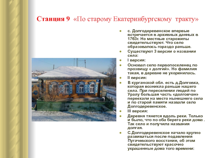 С.Долгодеревенское начало крупно развиваться после подавления Пугачевского восстания, об этом свидетельствуют красочно украшенные дома того времени:
