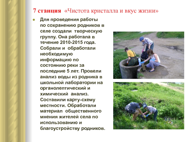 течение 2010-2015 года. Собрали и обработали необходимую информацию по состоянию реки за последние 5 лет. Провели анализ воды из родника в школьной лаборатории на органолептический и химический анализ. Составили карту-схему местности. Обработали материал общественного мнения жителей села по использованию и благоустройству родников.