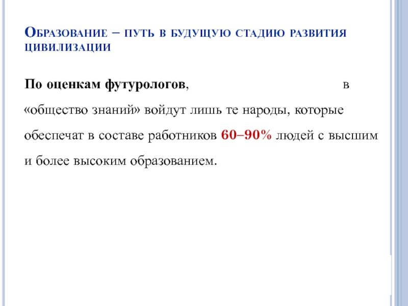 в «общество знаний» войдут лишь те народы, которые обеспечат в составе работников 60–90% людей с высшим и более высоким образованием.
