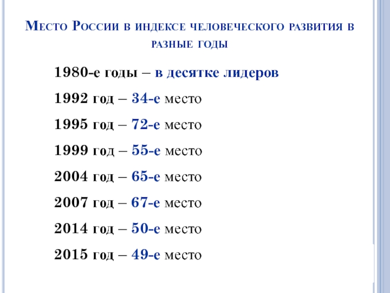 Слайд 36Место России в индексе человеческого развития в разные годы