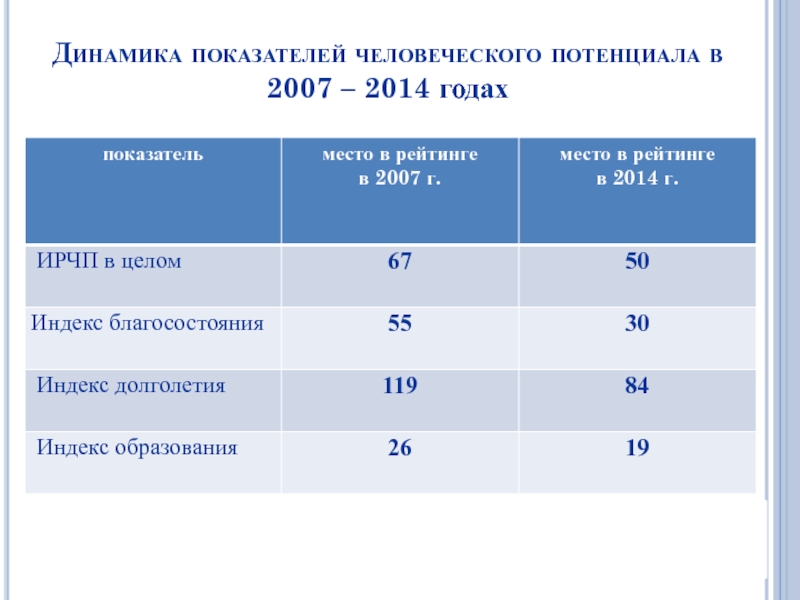 Слайд 37Динамика показателей человеческого потенциала в 2007 – 2014 годах