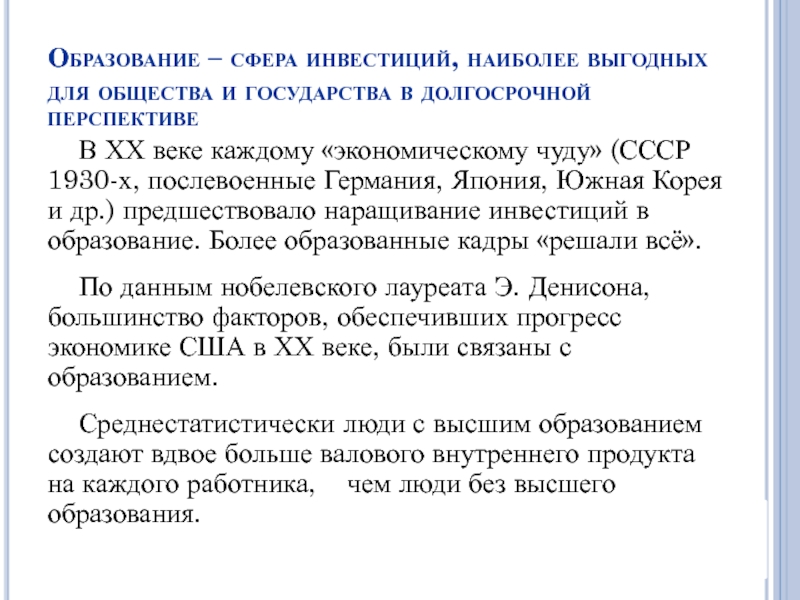 Слайд 32Образование – сфера инвестиций, наиболее выгодных для общества и государства