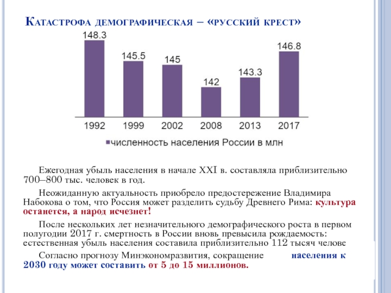 После нескольких лет незначительного демографического роста в первом полугодии 2017 г. смертность в России вновь превысила рождаемость: естественная убыль населения составила приблизительно 112 тысяч человек.