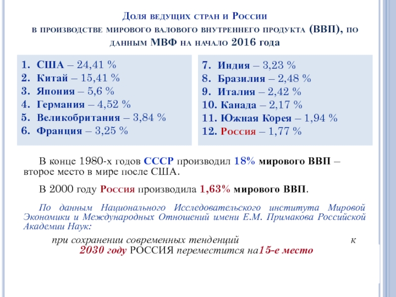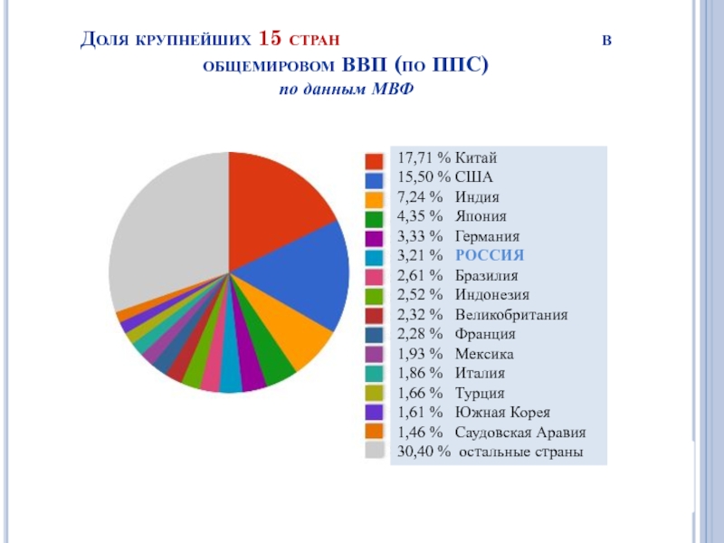 уровень жизни – определяется величиной реального ВВП на душу населения, переведённой в доллары с помощью паритета покупательной способности.
