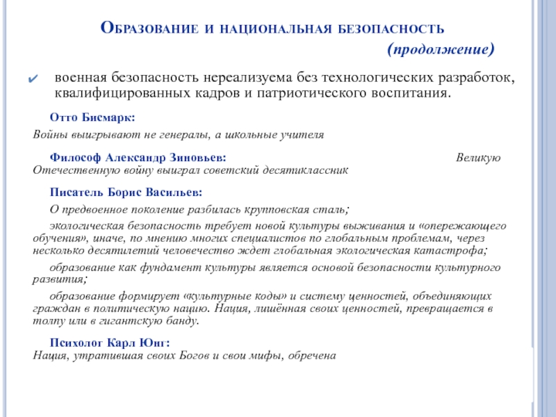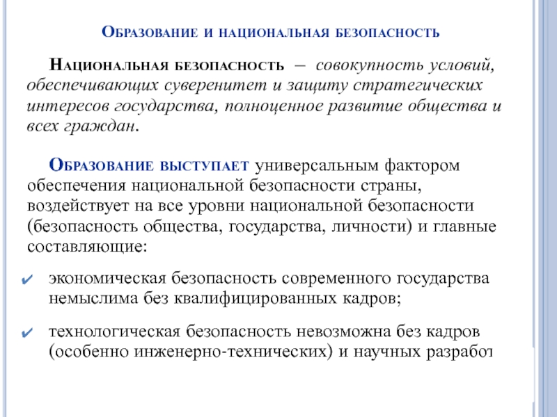 Образование выступает универсальным фактором обеспечения национальной безопасности страны, воздействует на все уровни национальной безопасности (безопасность общества, государства, личности) и главные составляющие: