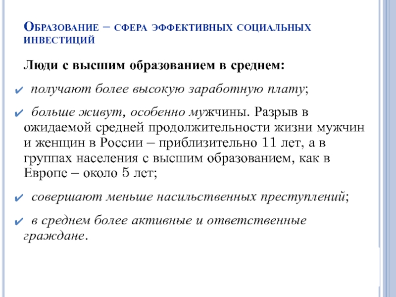 Слайд 33Образование – сфера эффективных социальных инвестиций