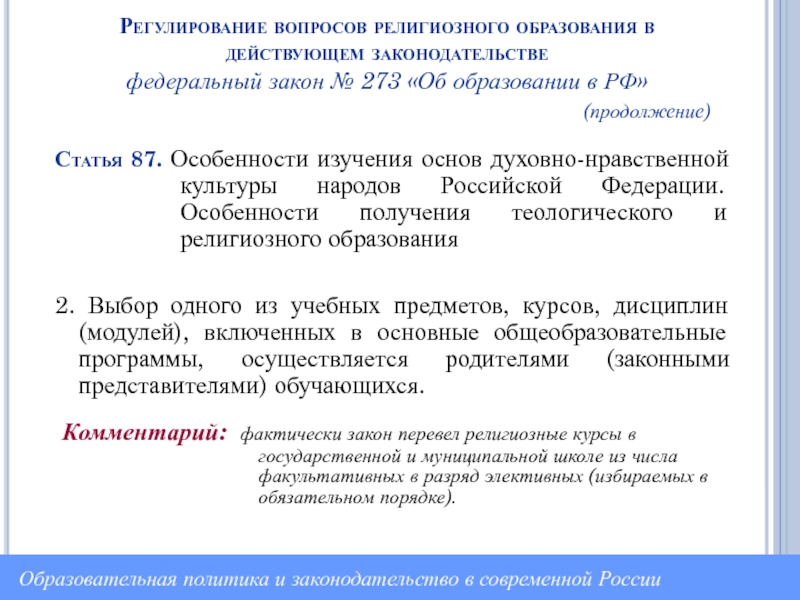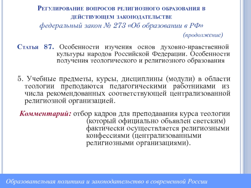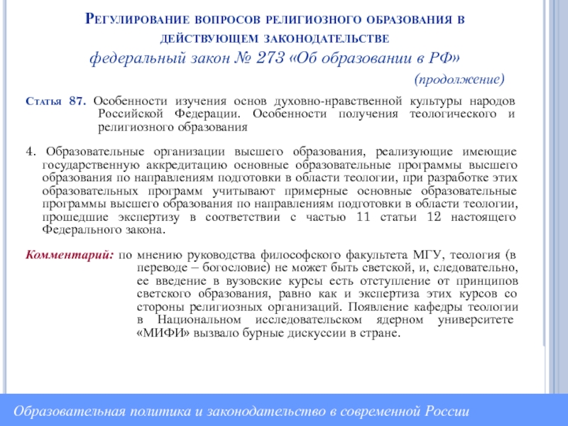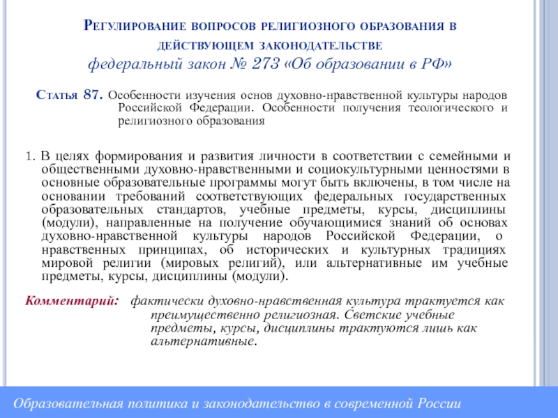 Статья 87. Особенности изучения основ духовно-нравственной культуры народов Российской Федерации. Особенности получения теологического и религиозного образования