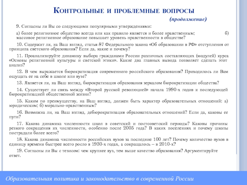 10. Содержит ли, на Ваш взгляд, статья 87 Федерального закона «Об образовании в РФ» отступления от принципа светского образования? Если да, какие и почему?