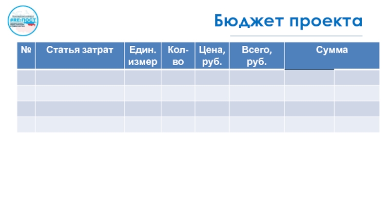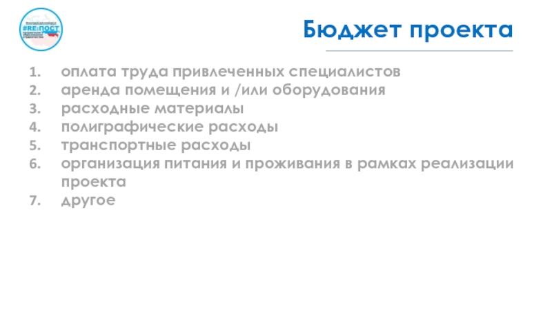 Бюджет проектаоплата труда привлеченных специалистов аренда помещения и /или оборудованиярасходные материалыполиграфические расходытранспортные расходыорганизация питания и проживания в