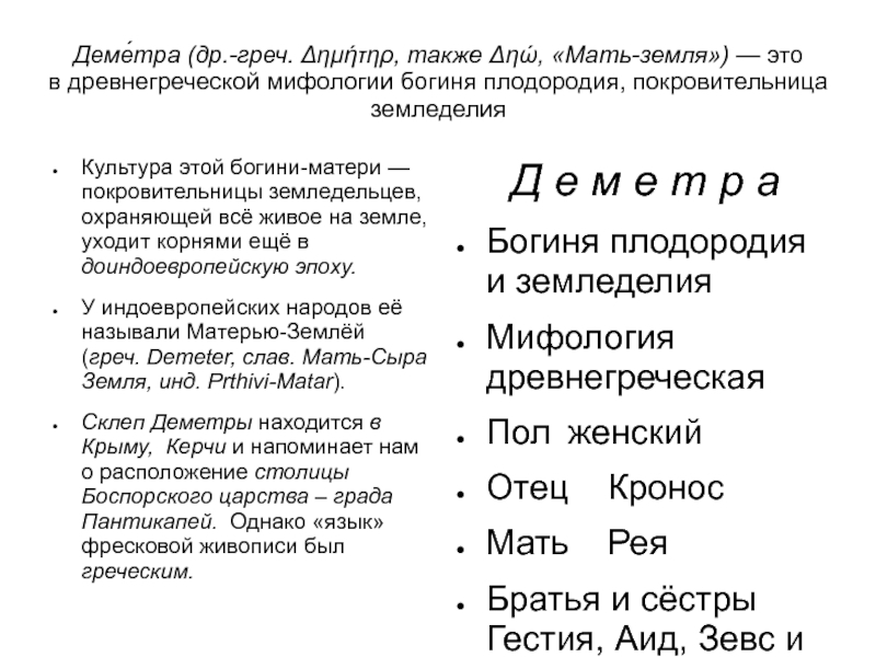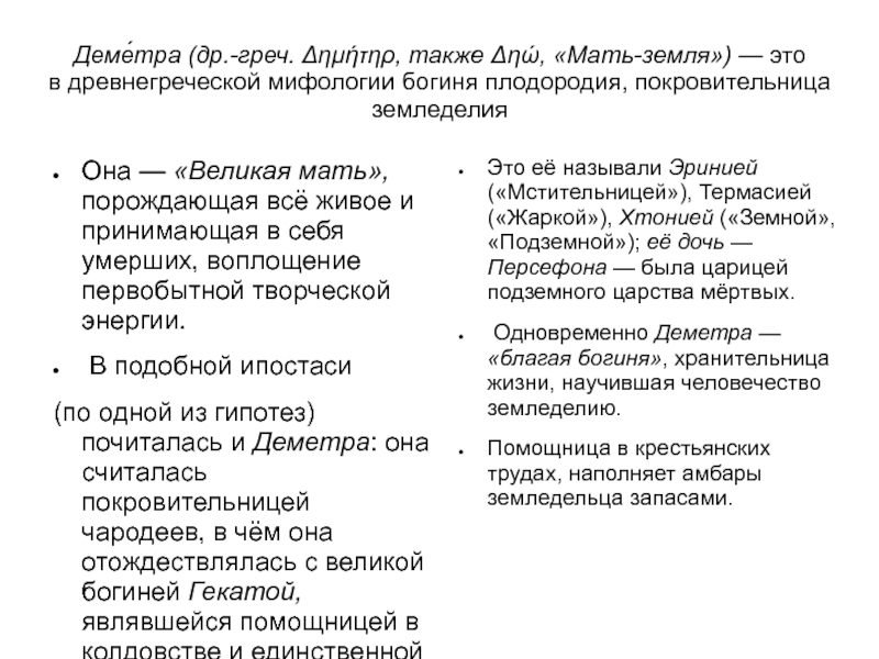 Это её называли Эринией («Мстительницей»), Термасией («Жаркой»), Хтонией («Земной», «Подземной»); её дочь — Персефона — была царицей подземного царства мёртвых.