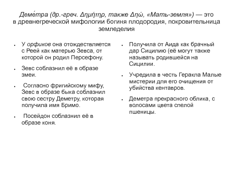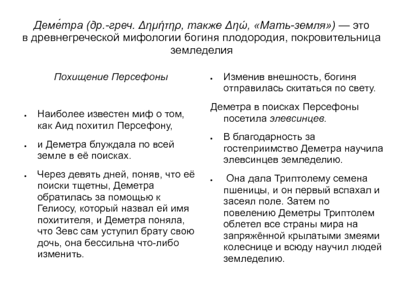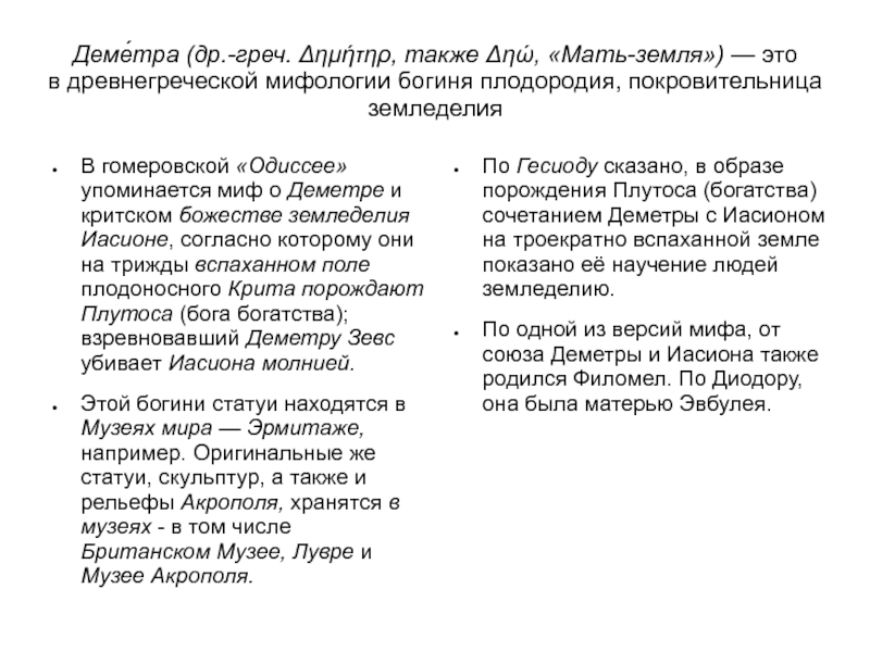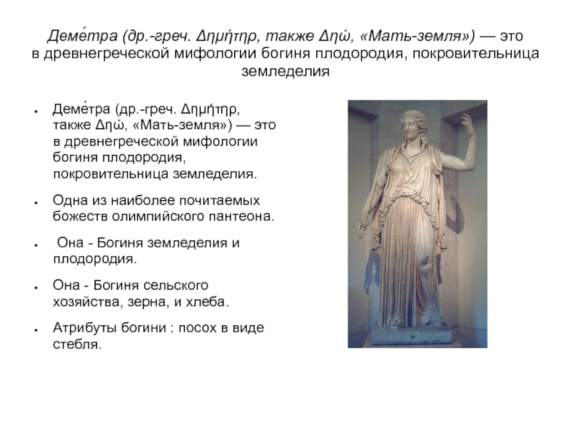 Одновременно Деметра — «благая богиня», хранительница жизни, научившая человечество земледелию.
