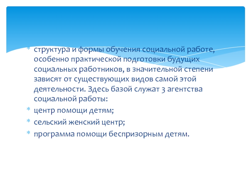 Слайд 14структура и формы обучения социальной работе, особенно практической подготовки будущих