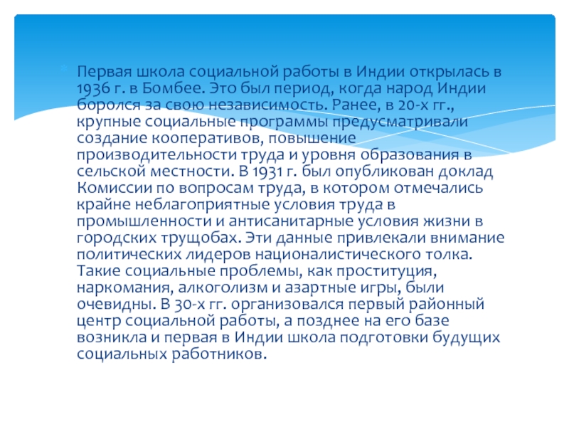 свою независимость. Ранее, в 20-х гг., крупные социальные программы предусматривали создание кооперативов, повышение производительности труда и уровня образования в сельской местности. В 1931 г. был опубликован доклад Комиссии по вопросам труда, в котором отмечались крайне неблагоприятные условия труда в промышленности и антисанитарные условия жизни в городских трущобах. Эти данные привлекали внимание политических лидеров националистического толка. Такие социальные проблемы, как проституция, наркомания, алкоголизм и азартные игры, были очевидны. В 30-х гг. организовался первый районный центр социальной работы, а позднее на его базе возникла и первая в Индии школа подготовки будущих социальных работников.