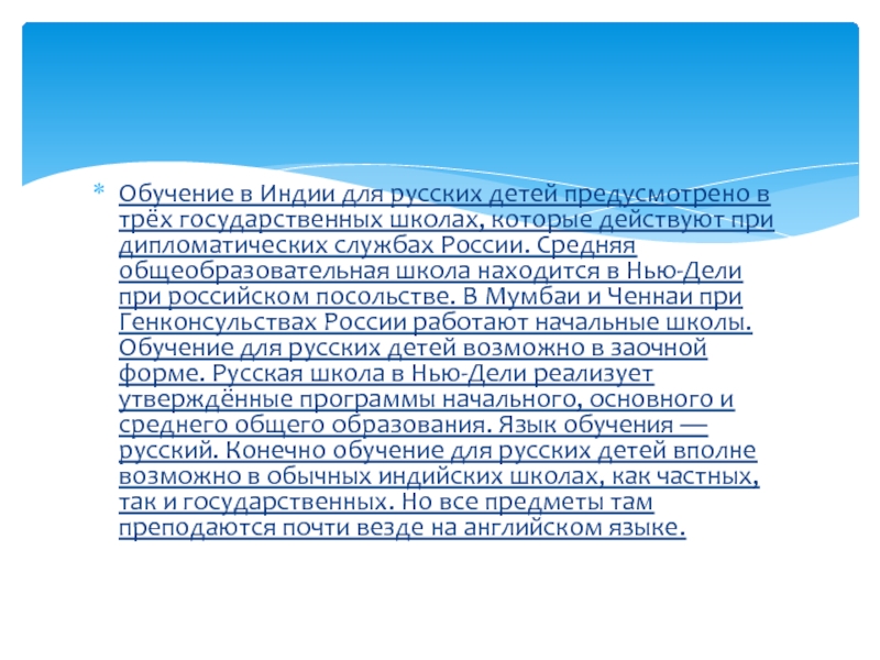 Слайд 10Обучение в Индии для русских детей предусмотрено в трёх государственных школах,