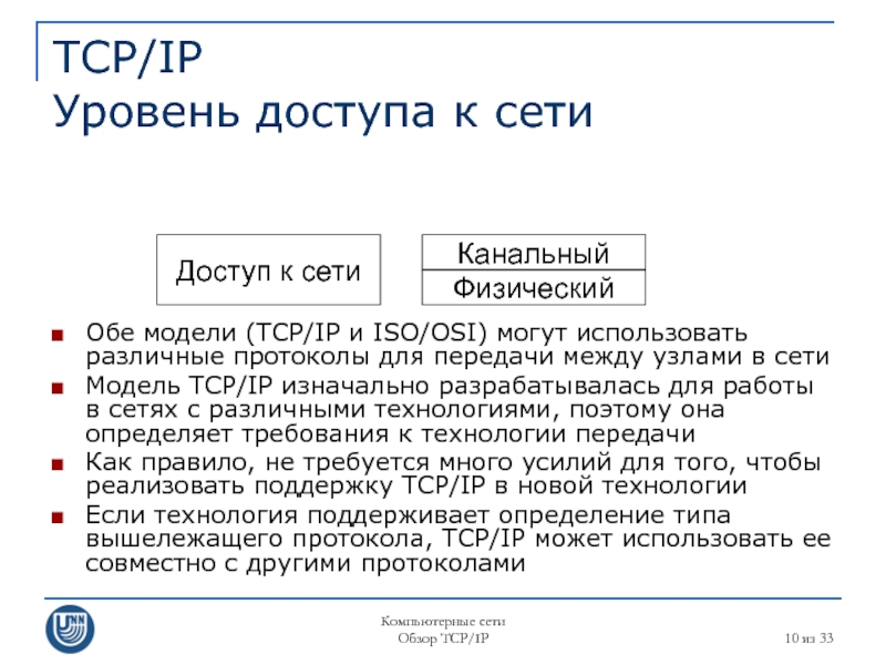 Модель TCP/IP изначально разрабатывалась для работы в сетях с различными технологиями, поэтому она определяет требования к технологии передачи