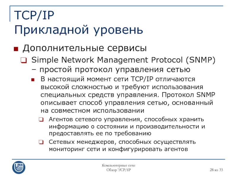 отличаются высокой сложностью и требуют использования специальных средств управления. Протокол SNMP описывает способ управления сетью, основанный на совместном использовании