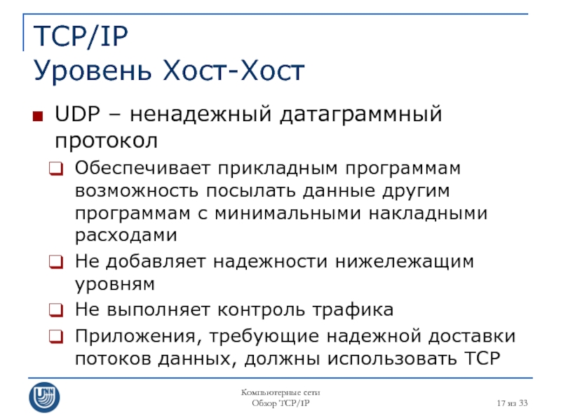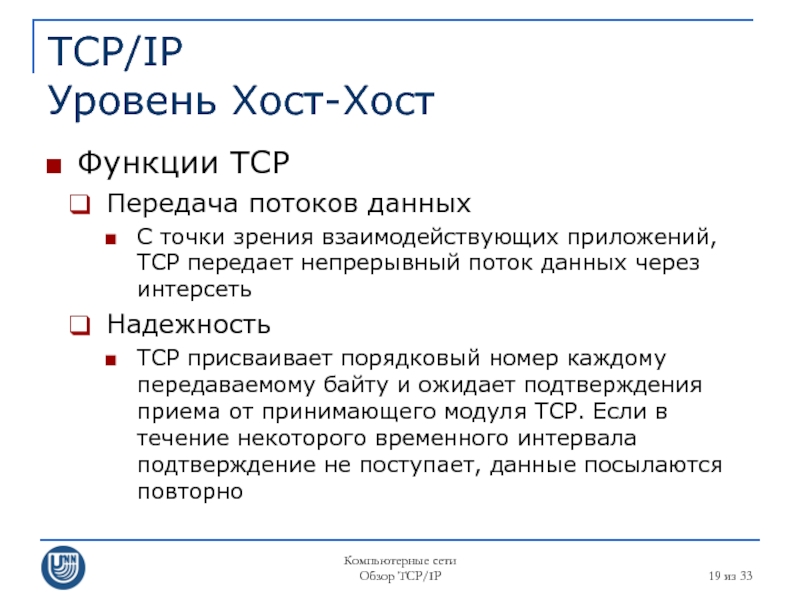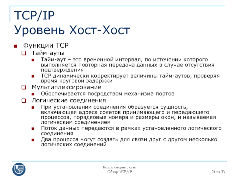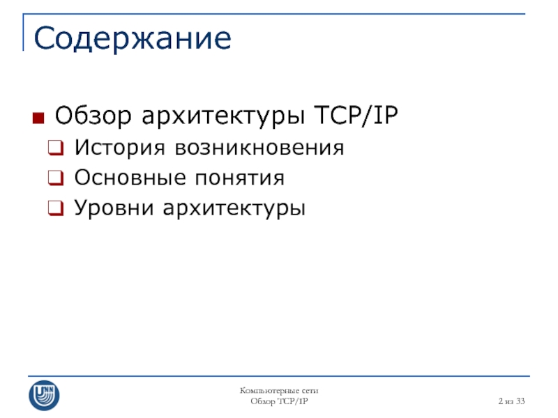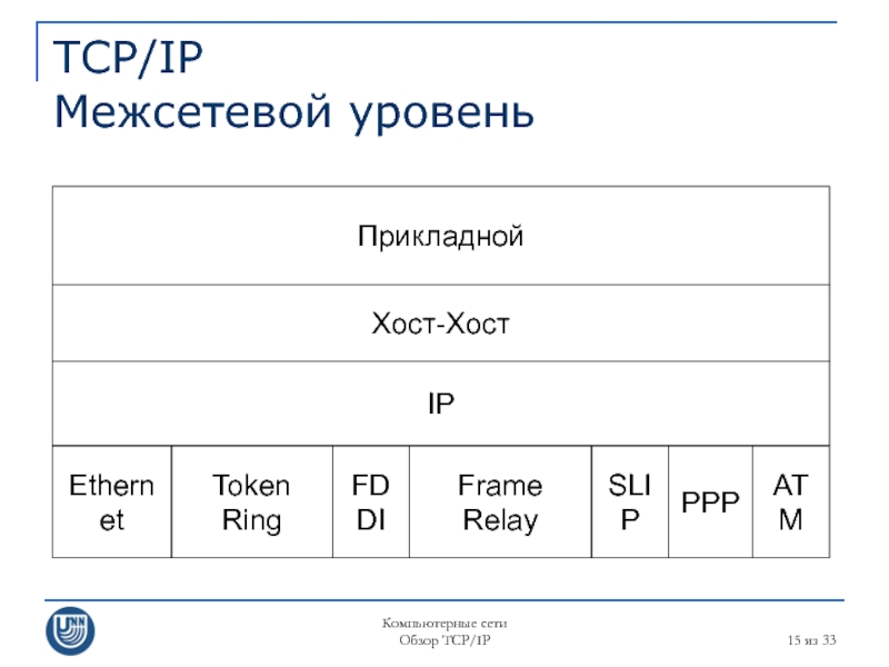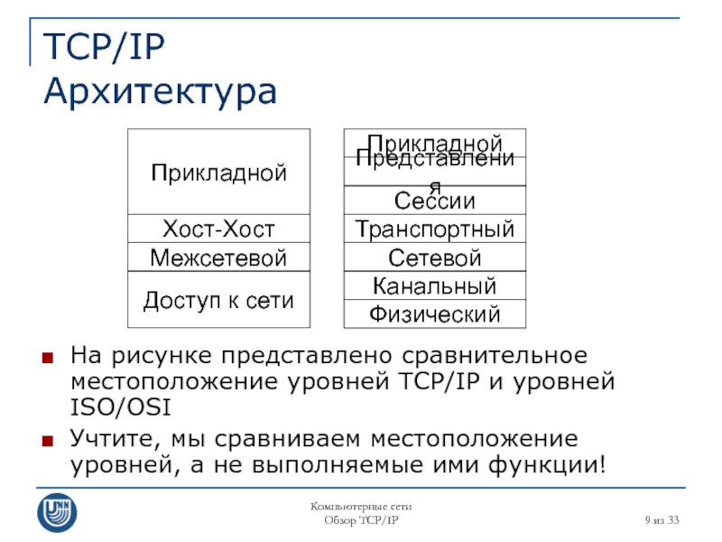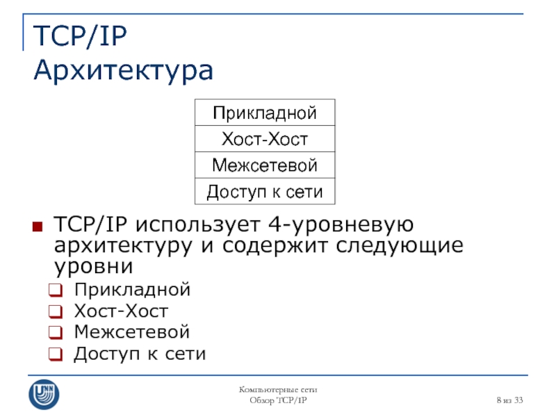 TCP/IP использует 4-уровневую архитектуру и содержит