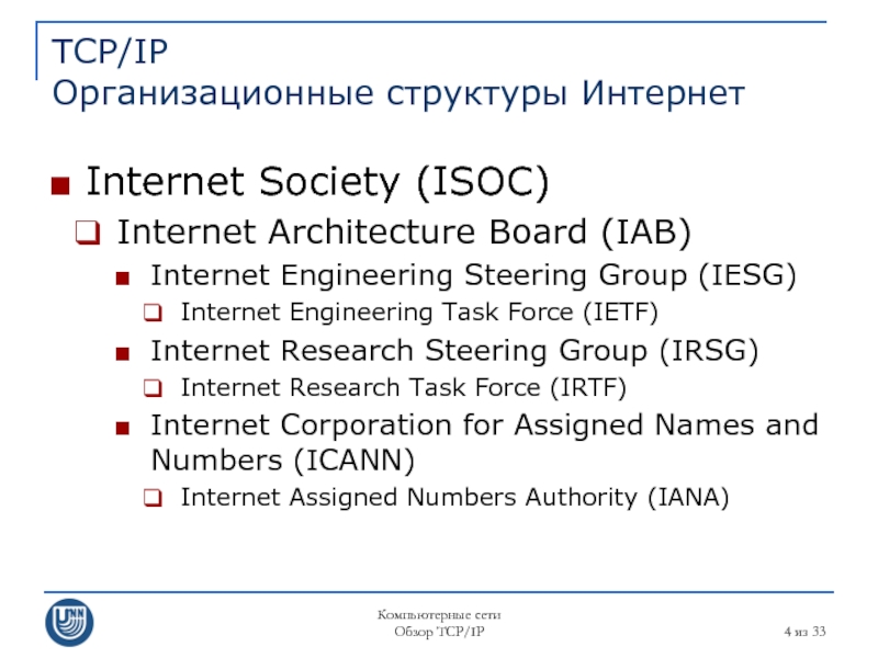 (IRTF) – координирует долгосрочные исследовательские проекты по протоколам TCP/IP