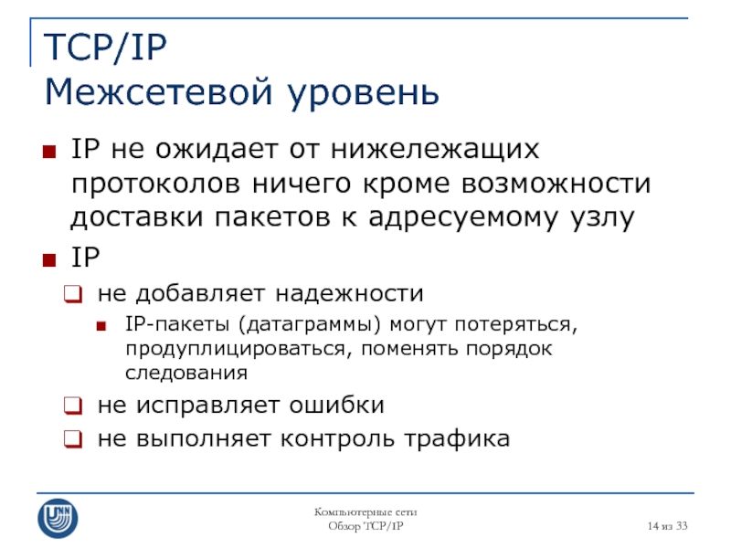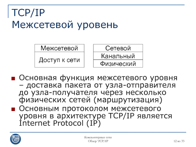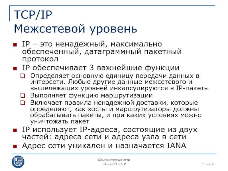 Основным протоколом межсетевого уровня в архитектуре TCP/IP является Internet Protocol (IP)