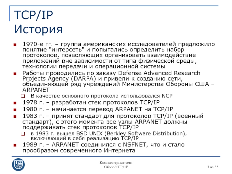 в 1983 г. вышел BSD UNIX (Berkley Software Distribution), включающий в себя реализацию TCP/IP