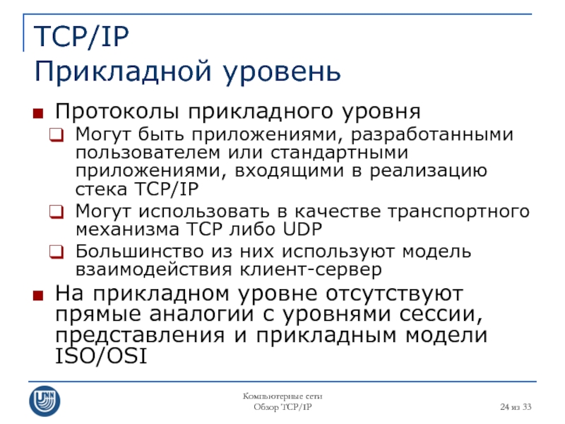 На прикладном уровне отсутствуют прямые аналогии с уровнями сессии, представления и прикладным модели ISO/OSI