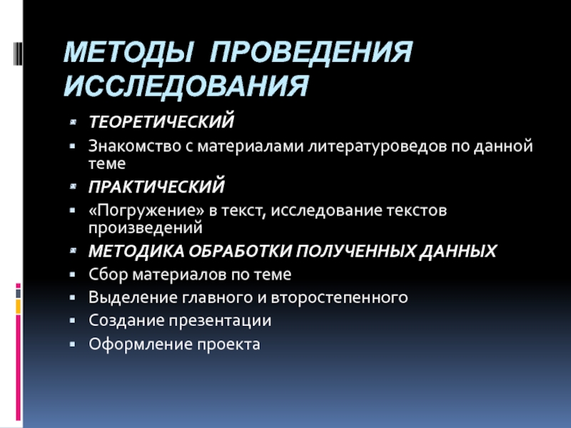 МЕТОДЫ ПРОВЕДЕНИЯ ИССЛЕДОВАНИЯ ТЕОРЕТИЧЕСКИЙЗнакомство с материалами литературоведов по данной темеПРАКТИЧЕСКИЙ«Погружение» в текст, исследование текстов произведенийМЕТОДИКА ОБРАБОТКИ ПОЛУЧЕННЫХ