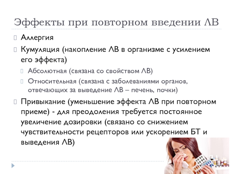 Привыкание (уменьшение эффекта ЛВ при повторном приеме) - для преодоления требуется постоянное увеличение дозировки (связано со снижением чувствительности рецепторов или ускорением БТ и выведения ЛВ)