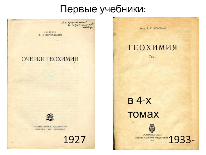 А. Е. Ферсман (1883-1945) впервые в 1911 г. прочел курс лекций по геохимии. Он является автором “Геохимии” в 4х т.