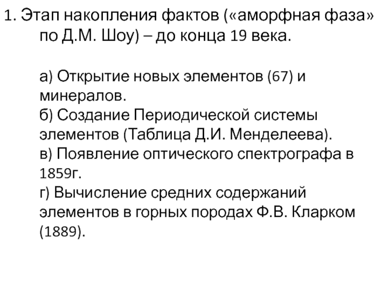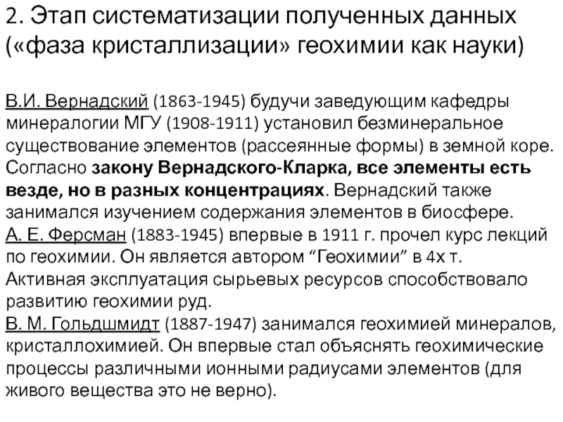 Слайд 392. Этап систематизации полученных данных («фаза кристаллизации» геохимии как науки)