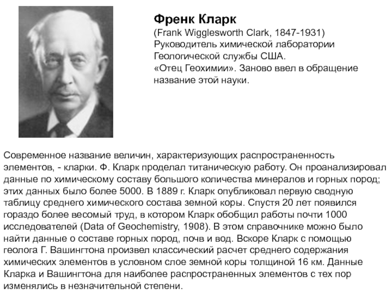Слайд 43Современное название величин, характеризующих распространенность элементов, - кларки. Ф. Кларк