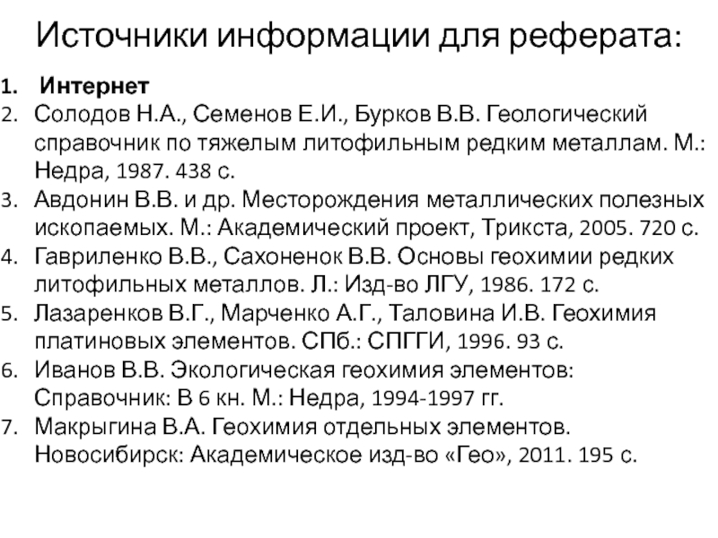 Гавриленко В.В., Сахоненок В.В. Основы геохимии редких литофильных металлов. Л.: Изд-во ЛГУ, 1986. 172 с.