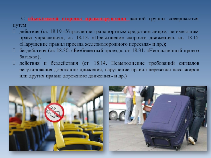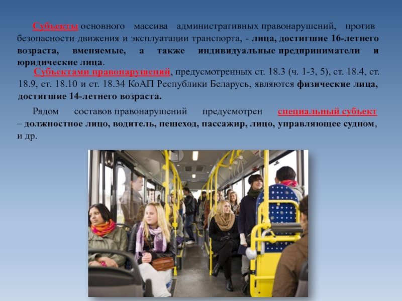 Рядом составов правонарушений предусмотрен специальный субъект – должностное лицо, водитель, пешеход, пассажир, лицо, управляющее судном, и др.