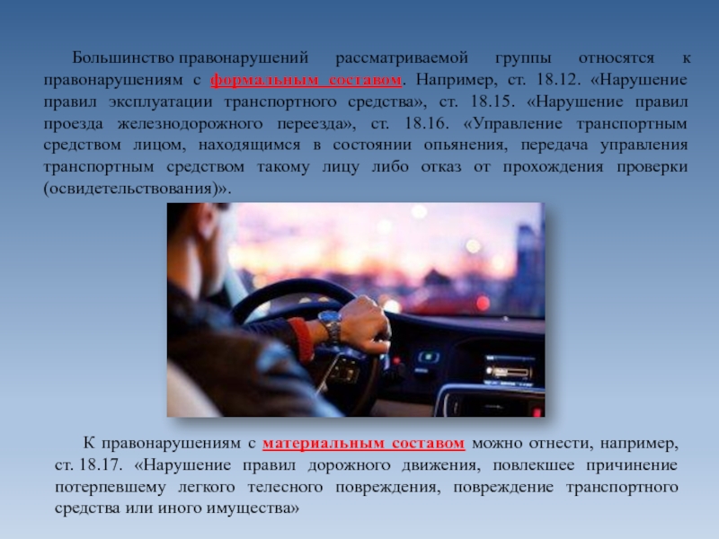 К правонарушениям с материальным составом можно отнести, например, ст. 18.17. «Hарушение правил дорожного движения, повлекшее причинение потерпевшему легкого телесного повреждения, повреждение транспортного средства или иного имущества»