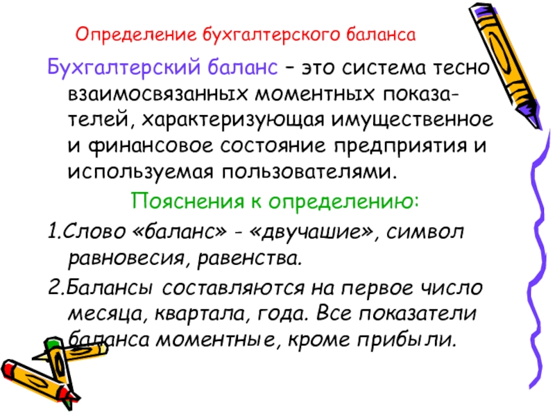2.Балансы составляются на первое число месяца, квартала, года. Все показатели баланса моментные, кроме прибыли.