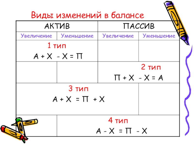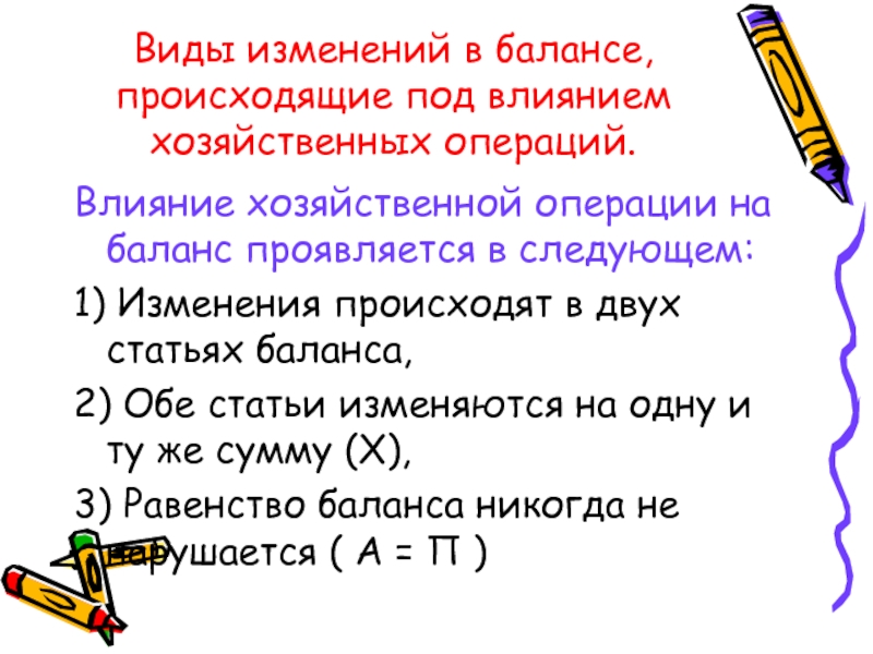 Слайд 25Виды изменений в балансе, происходящие под влиянием хозяйственных операций.