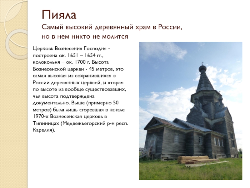 колокольня – ок. 1700 г. Высота Вознесенской церкви - 45 метров, это самая высокая из сохранившихся в России деревянных церквей, и вторая по высоте из вообще существовавших, чья высота подтверждена документально. Выше (примерно 50 метров) была лишь сгоревшая в начале 1970-х Вознесенская церковь в Типиницах (Медвежьегорский р-н респ. Карелия).