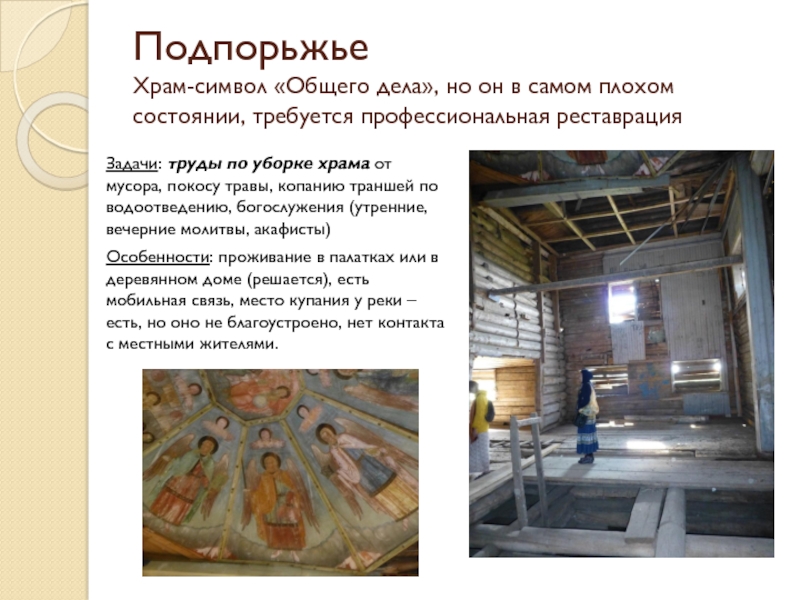 Программа может быть изменена в зависимости от объема работ по храму. Поскольку храм – памятник Федерального значения, работы могут быть только по очистке храма от мусора.