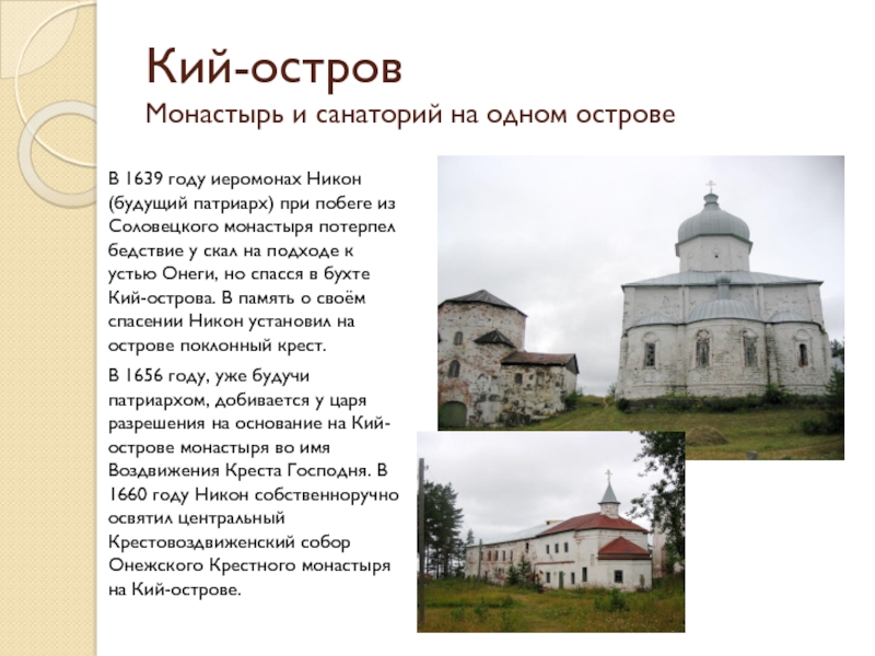 В 1656 году, уже будучи патриархом, добивается у царя разрешения на основание на Кий-острове монастыря во имя Воздвижения Креста Господня. В 1660 году Никон собственноручно освятил центральный Крестовоздвиженский собор Онежского Крестного монастыря на Кий-острове.