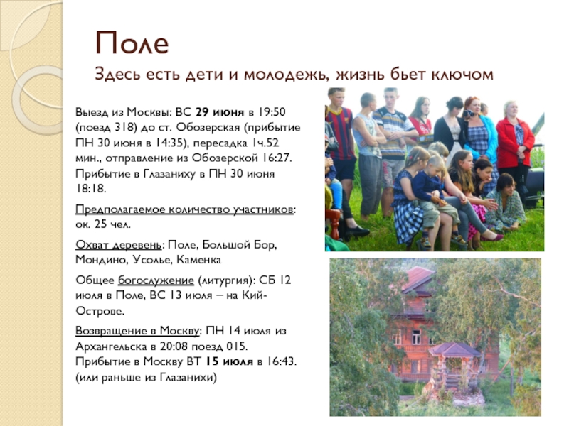 Особенности: проживание в кирпичном здании местной администрации и школе (решается), нет мобильной связи, есть место купания у реки, есть контакт с местными жителями. Есть приходской дом для приготовления еды и трапезы. Надо взять с собой спальники и пенки.