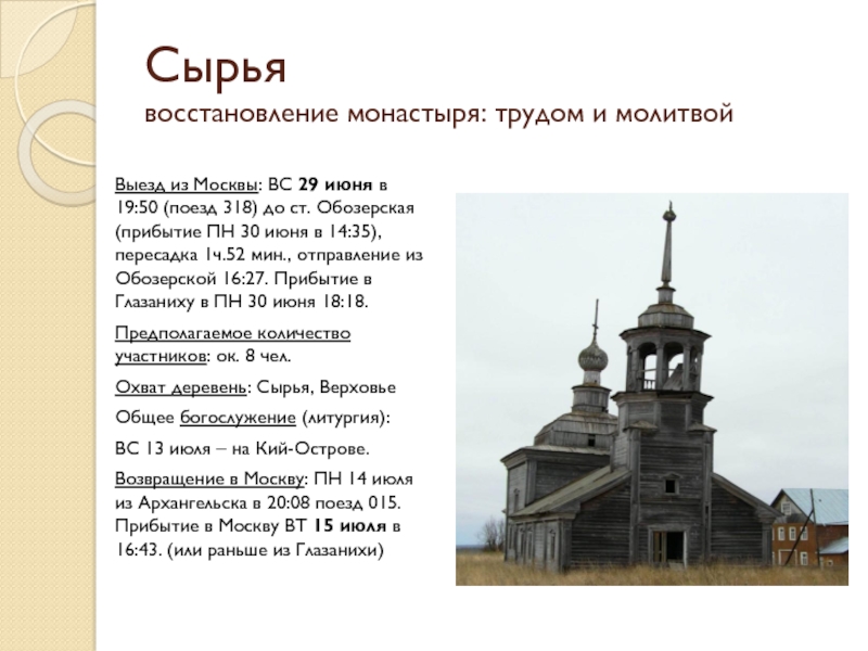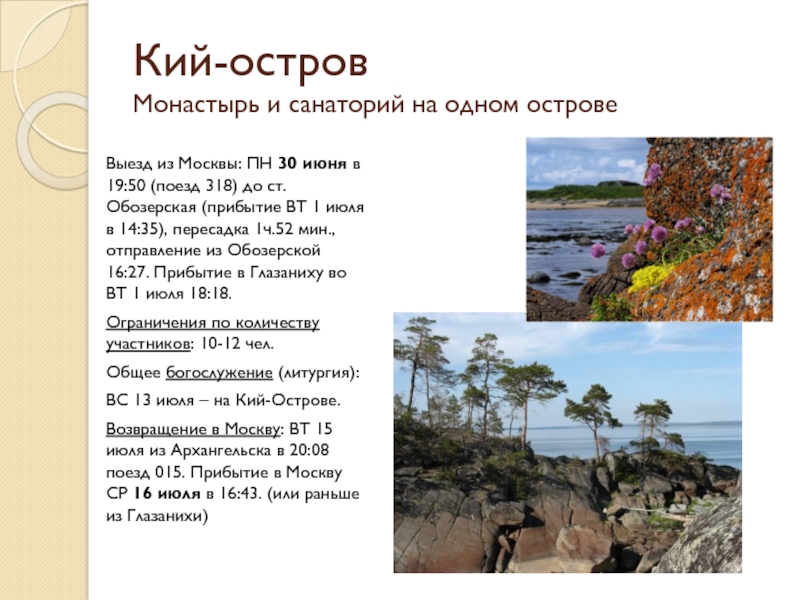 Особенности: проживание комнатах местного санатория (или в рыбацком доме на своих спальниках), есть мобильная связь, место купания – Белое море. Местные экскурсоводы далеко не все верующие. Нужна максимальная дипломатичность, приветливость, умение со всеми находить общий язык.