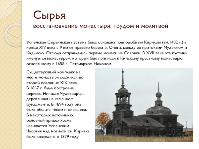 от правого берега р. Онеги, между её притоками Мудьюгом и Кадьмою. Отсюда отправлялись первые монахи на Соловки. В XVII веке эта пустынь именуется монастырём, который был приписан к Кийскому крестному монастырю, основанному в 1658 г. Патриархом Никоном.