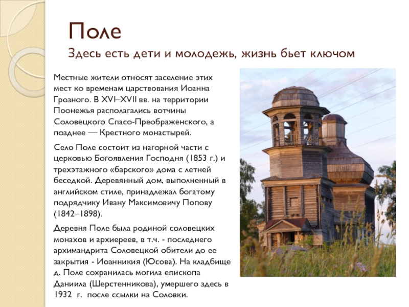 Село Поле состоит из нагорной части c церковью Богоявления Господня (1853 г.) и трехэтажного «барского» дома с летней беседкой. Деревянный дом, выполненный в английском стиле, принадлежал богатому подрядчику Ивану Максимовичу Попову (1842–1898).