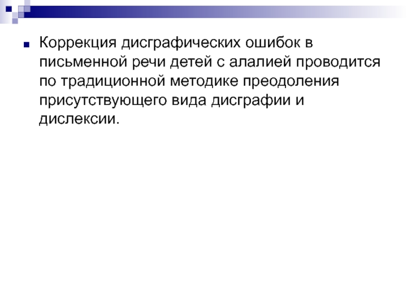 Слайд 71Коррекция дисграфических ошибок в письменной речи детей с алалией проводится