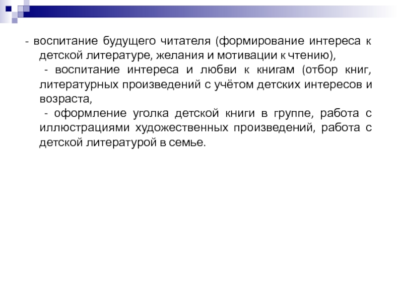 Слайд 14- воспитание будущего читателя (формирование интереса к детской литературе, желания