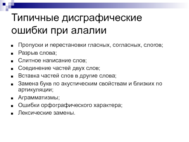 Слайд 68Типичные дисграфические ошибки при алалии