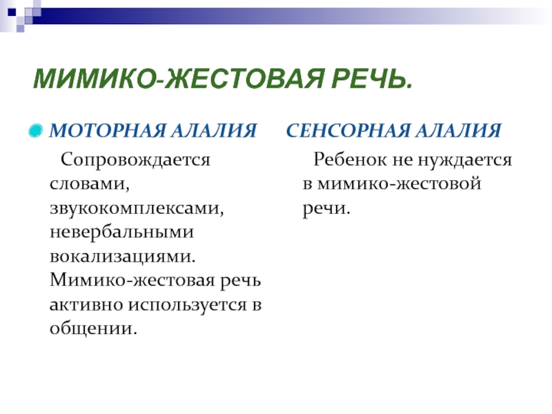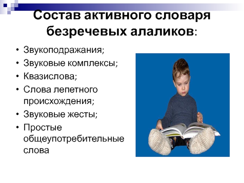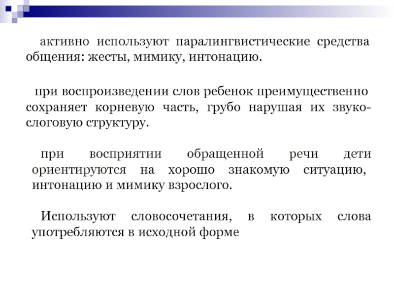 не полное отсутствии вербальных средств коммуникации: отдельные звуки и их сочетания — звукокомплексы и звукоподражания, обрывки лепетных слов, отдельные слова, совпадающие с нормами языка, обозначая как названия предметов, так и некоторые их признаки и действия, совершаемые с этими предметами.