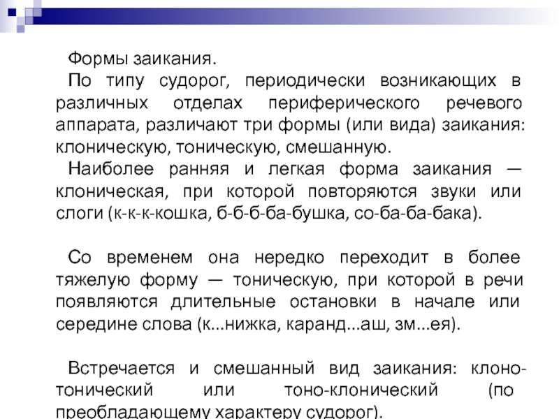 периферического речевого аппарата, различают три формы (или вида) заикания: клоническую,