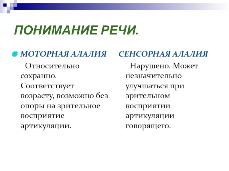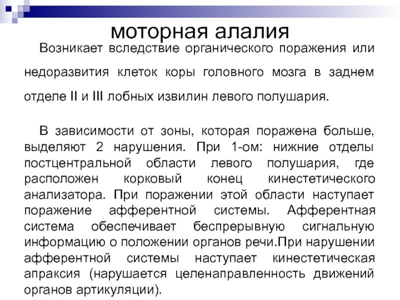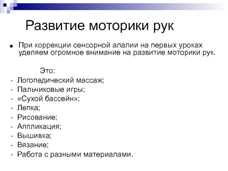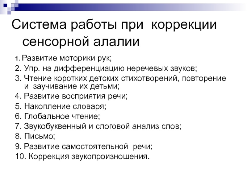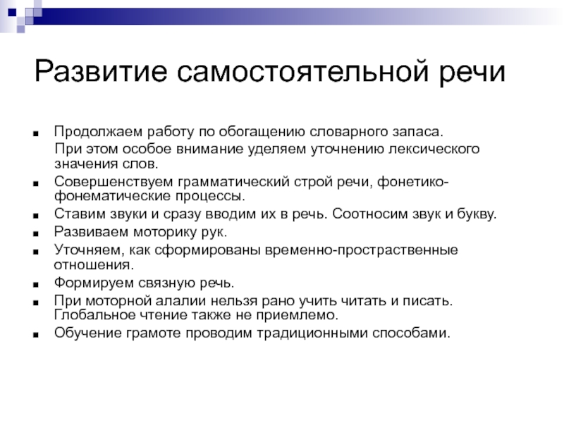 При моторной алалии нельзя рано учить читать и писать. Глобальное чтение также не приемлемо.
