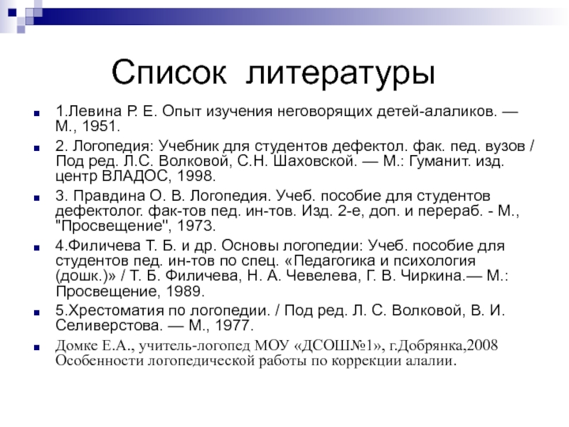 4.Филичева Т. Б. и др. Основы логопедии: Учеб. пособие для студентов пед. ин-тов по спец. «Педагогика и психология (дошк.)» / Т. Б. Филичева, Н. А. Чевелева, Г. В. Чиркина.— М.: Просвещение, 1989.